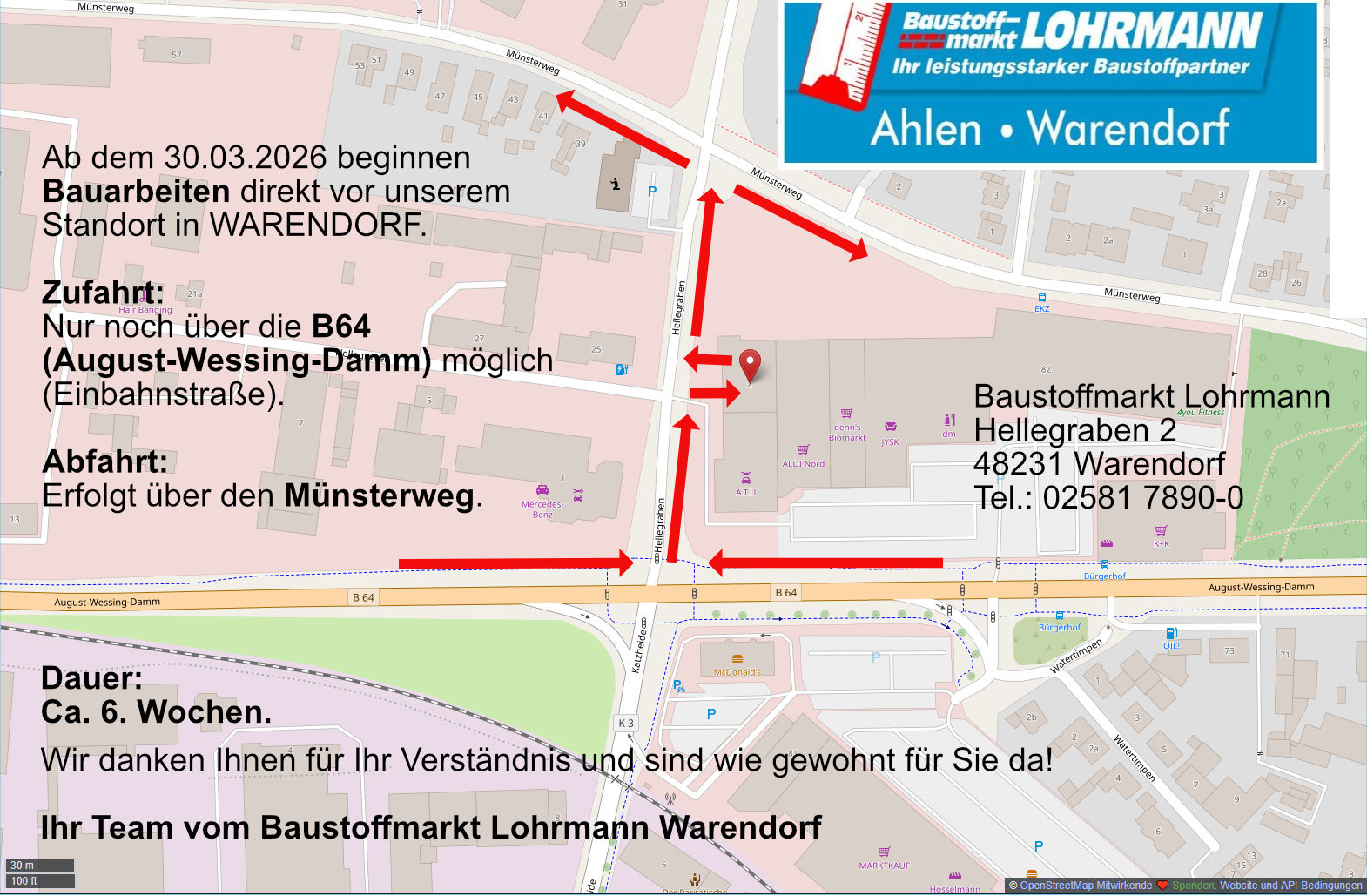 Zufahrt ist ab dem 30.03. für ca. sechs Wochen nur über die B64 (August-Wessing-Damm) möglich (Einbahnstraße).